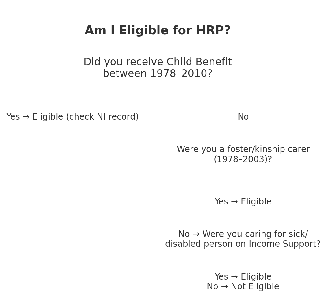 HRP reduced the number of qualifying NI years you needed for a full State Pension. For example, if you were a parent on Child Benefit, HRP ensured you weren’t penalised for years out of the workforce. From 2010, HRP years were converted into National Insurance credits.