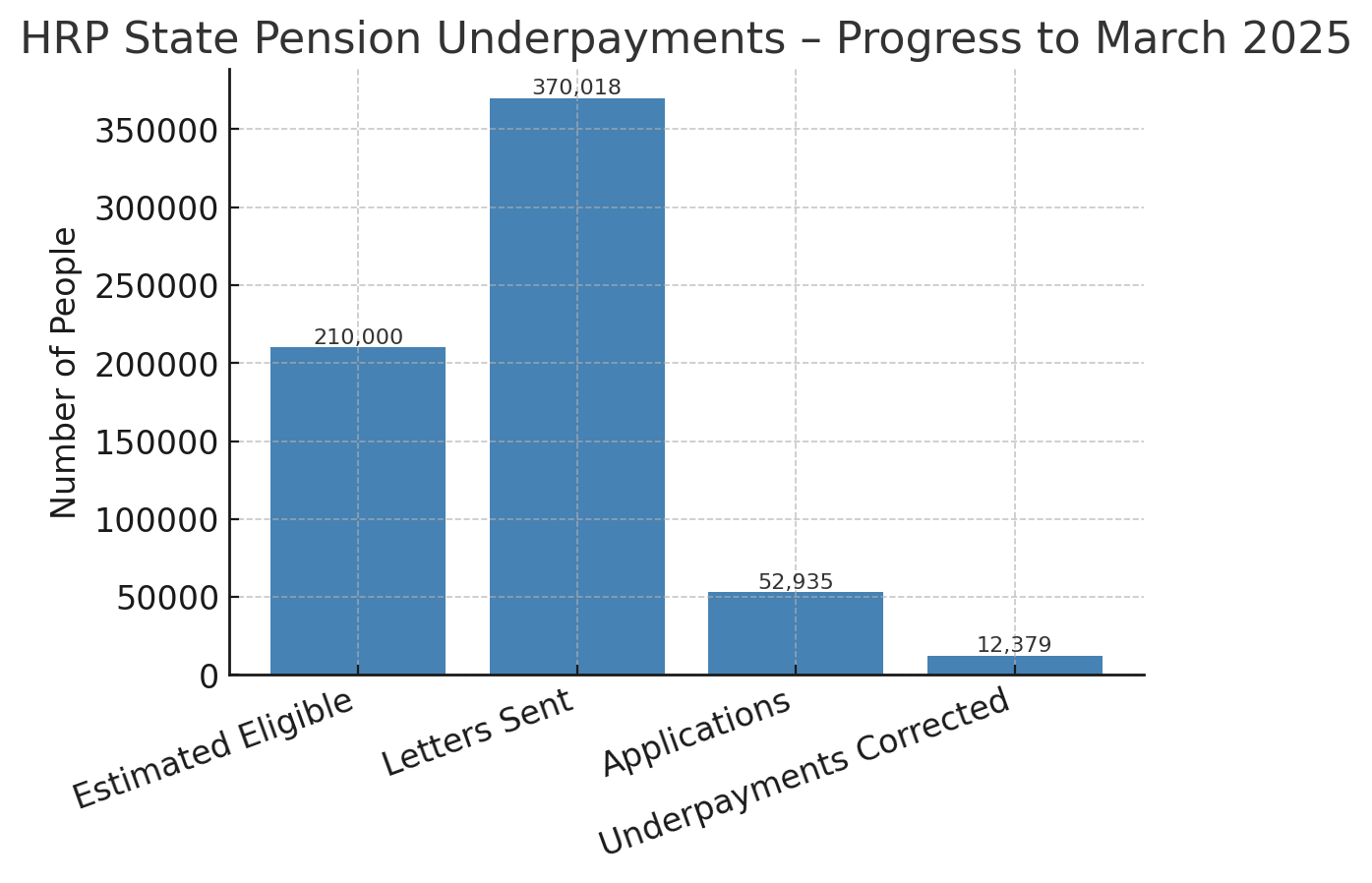 • **Formal recognition and public updates** — The government has acknowledged the problem and is publishing rolling progress updates on GOV.UK (latest to 31 March 2025: https://www.gov.uk/government/publications/home-responsibilities-protection-hrp-state-pension-underpayments-progress-on-cases-reviewed-to-31-march-2025). That transparency matters for people deciding whether to apply.