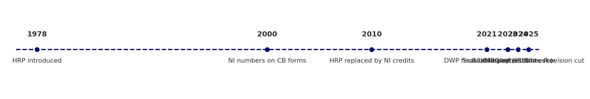From May 2000, Child Benefit claim forms began routinely capturing the claimant’s National Insurance number, which reduced the risk of HRP not being linked to the right person. This change is referenced in GOV.UK materials (see HRP pages above) and later HMRC communications resources for stakeholders: https://www.gov.uk/government/publications/home-responsibilities-protection-communication-resources.