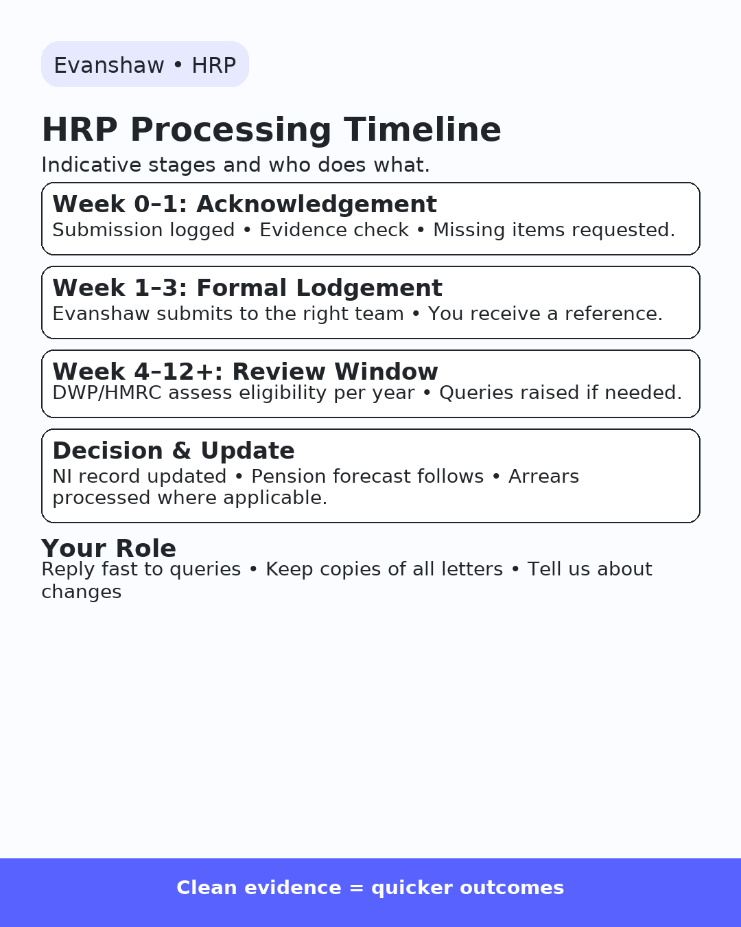 Example: A client received a query on two years. After supplying a Child Benefit letter and a GP note with dates, both years were credited and arrears were paid.