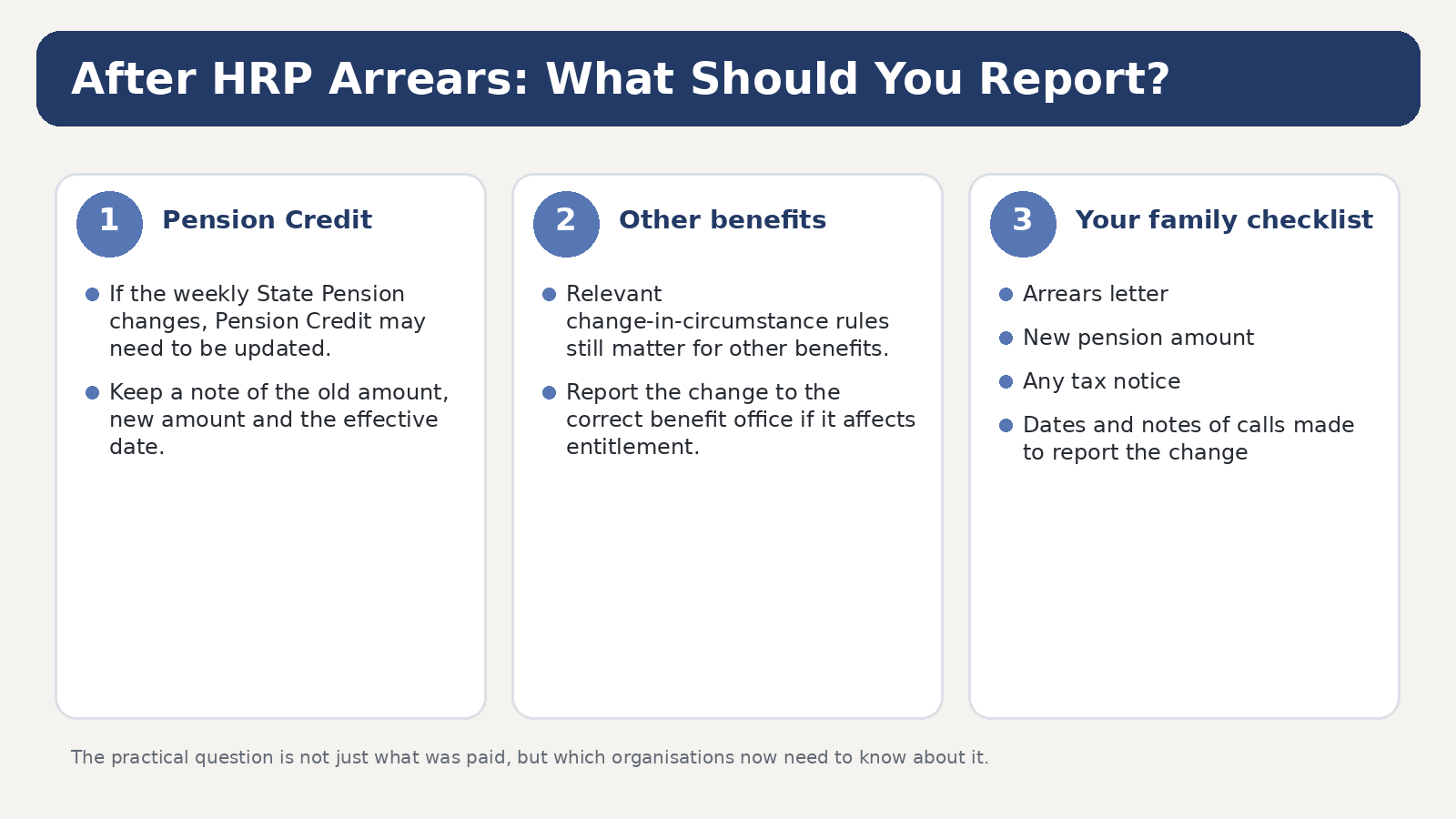 For this type of case, good record-keeping matters more than families expect. Keep the HRP decision, the revised State Pension letter, any arrears explanation, and any later HMRC tax letter together in one file. If you notify Pension Credit or another benefit office, keep a note of the date, the updated figure you gave them, and who you spoke to.