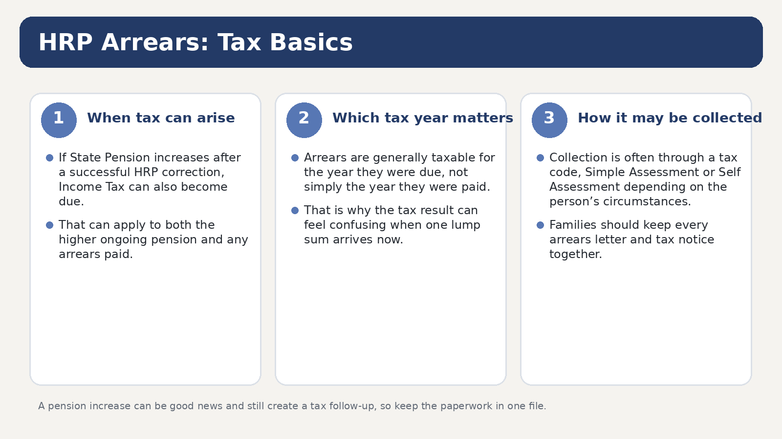 Yes — HRP arrears can be taxable, and yes — a successful HRP correction can also affect Pension Credit and other benefits. But the right response is not panic. It is orderly follow-up.
