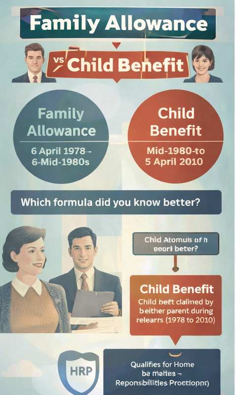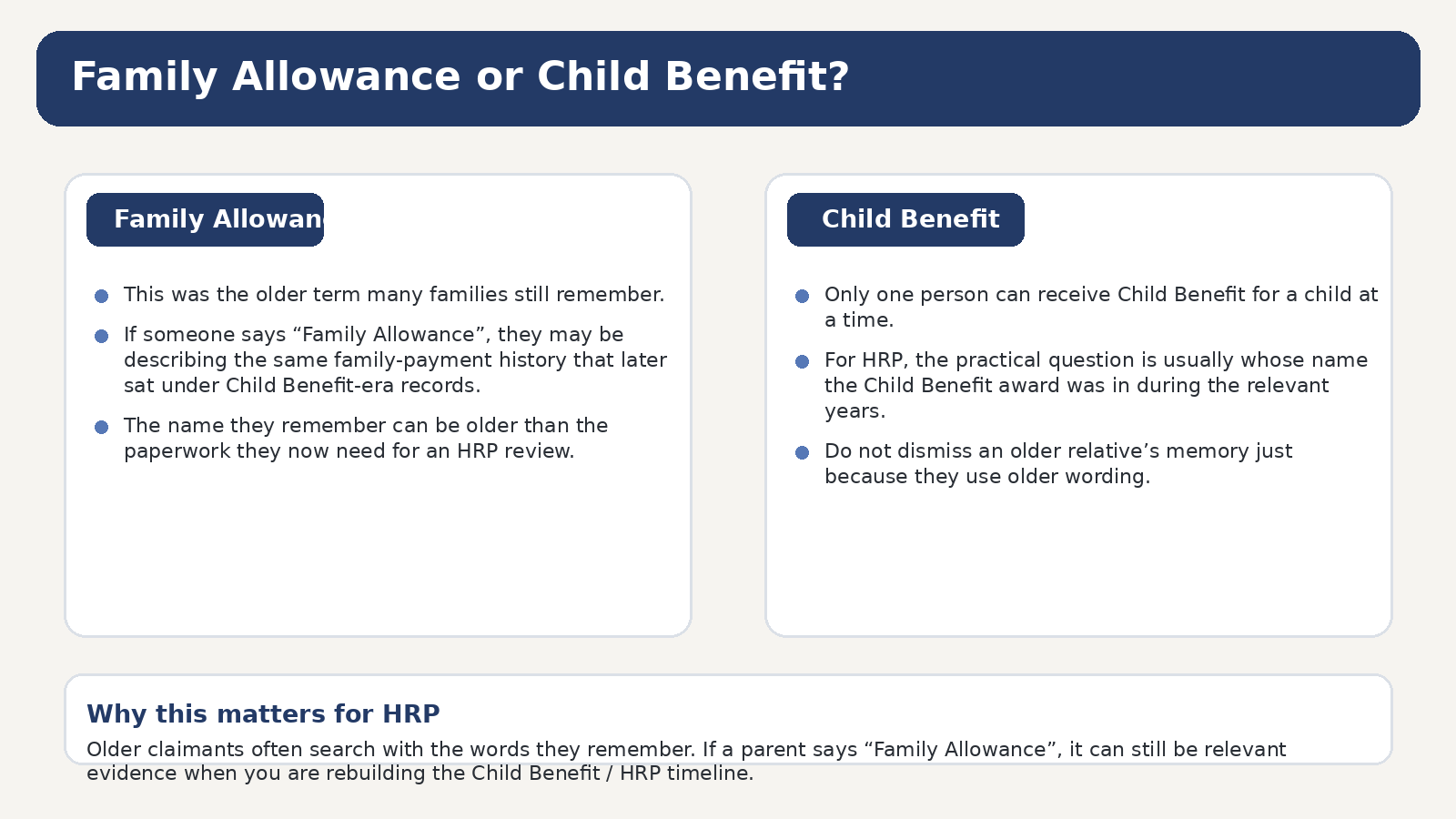 The terminology shift matters because modern HRP guidance usually talks about Child Benefit, while the lived memory of the relevant years may be Family Allowance first, then Child Benefit. If a claimant thinks those are two separate issues, they can wrongly assume HRP does not apply to them.