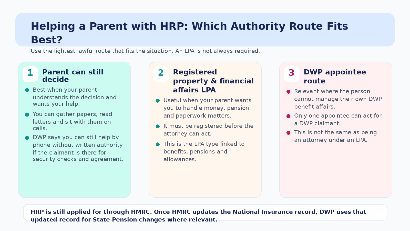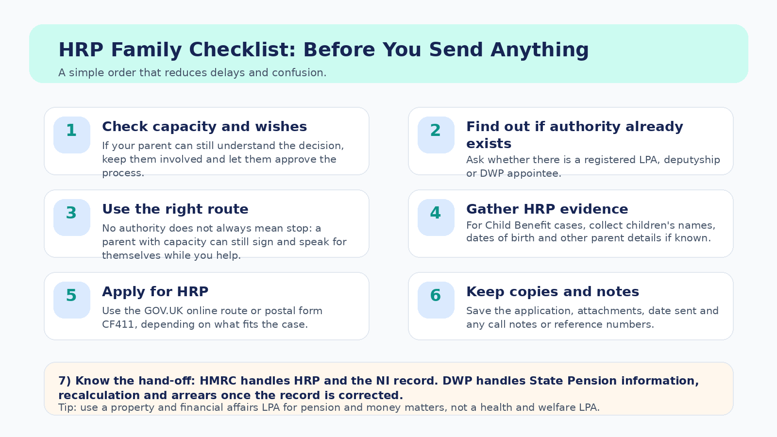 That split matters because families sometimes think DWP can simply ‘fix HRP’. Usually the route starts with the HRP application and the National Insurance record, and only then feeds into the pension side.