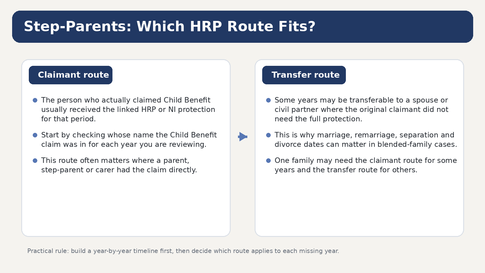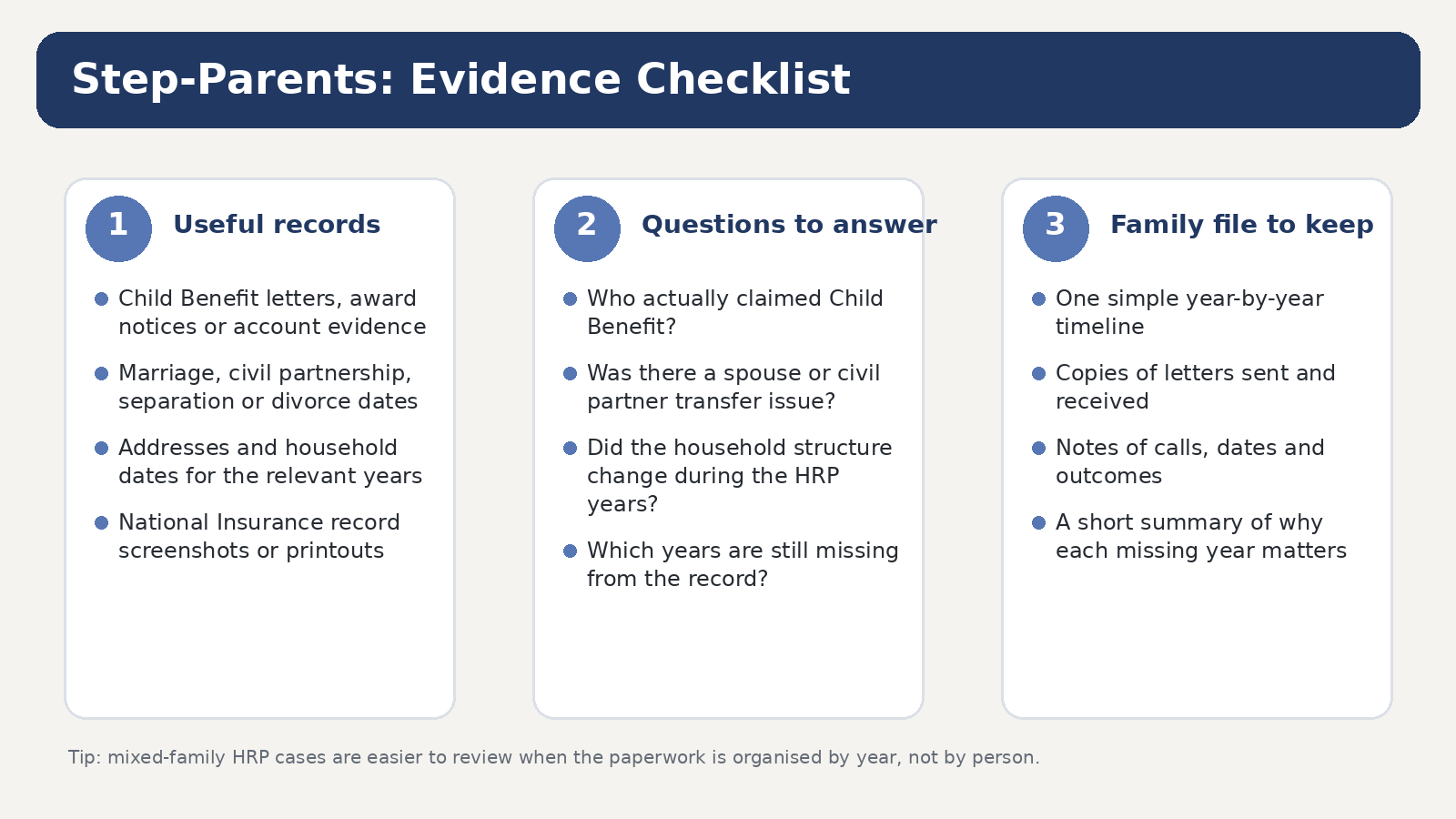 HRP in blended families is usually about records, not emotion. The key is to identify the correct route for each year: direct Child Benefit claimant, partner transfer, or another caring route. Once you do that, the case becomes much easier to evidence and much less likely to get lost in family history.