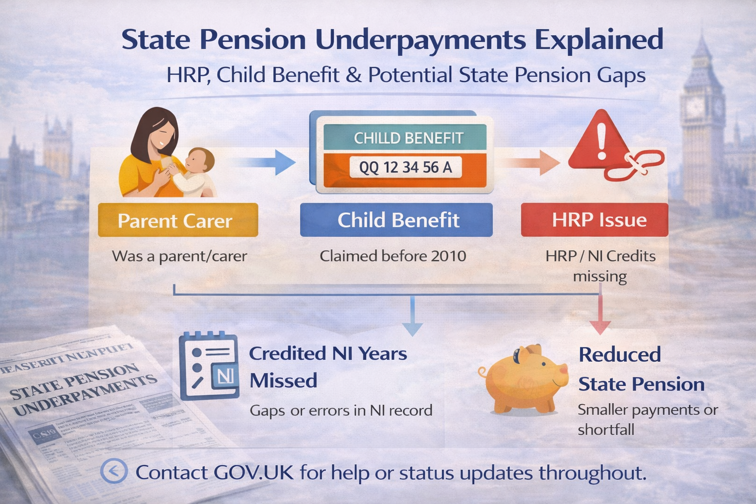 The problem: in many cases HRP was not recorded correctly on a person’s National Insurance (NI) record, especially for people who claimed Child Benefit before May 2000. That can mean a lower State Pension and (for some people) back pay.