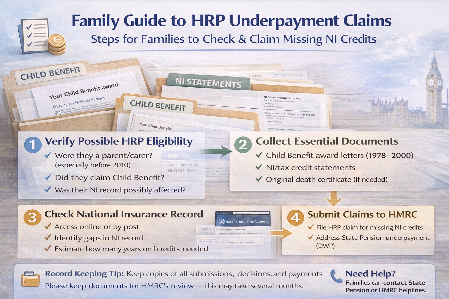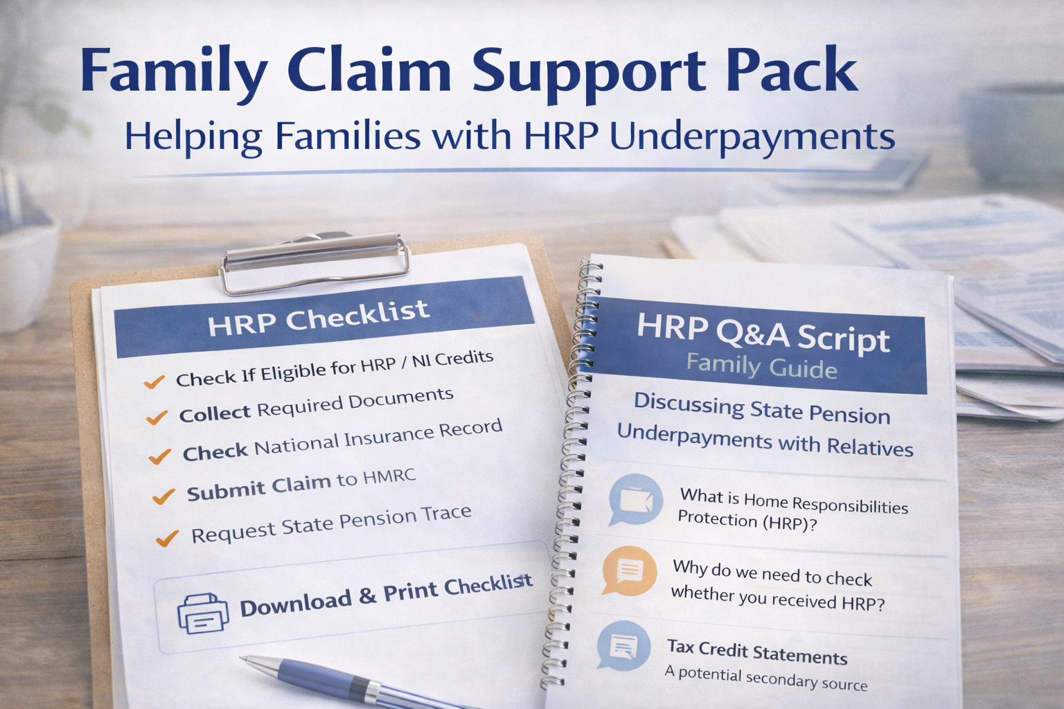 Many people only discover HRP when a family member spots that Mum or Dad’s State Pension looks lower than expected, or their National Insurance (NI) record shows gaps during years they were caring for children. This support pack is designed for families - the adult child, spouse, sibling, or trusted friend - who are helping someone else check things calmly and correctly.